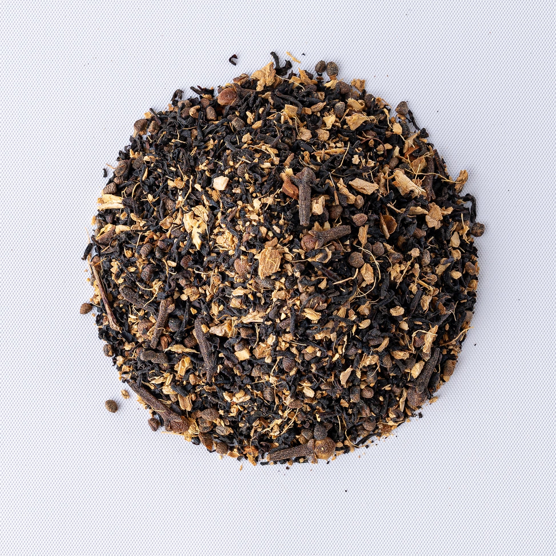 Ingredients: Whole Leaf Black Tea, Ginger Root, Cinnamon Chips, Crushed Green Cardamom, and Chai Flavoring
